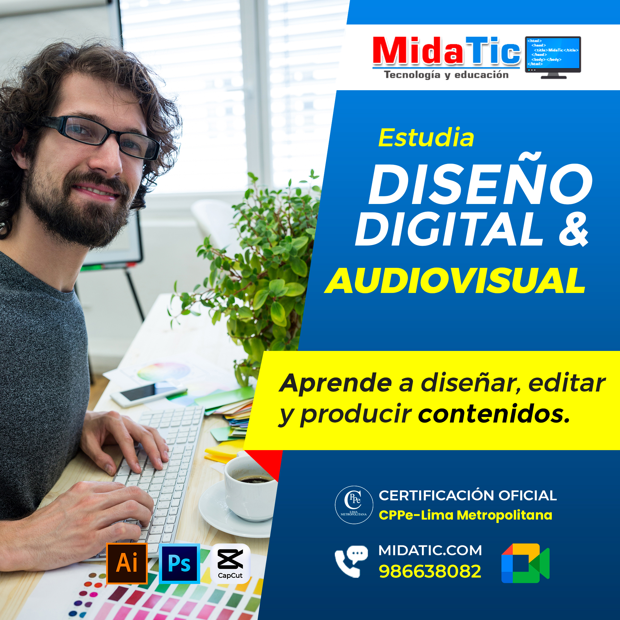 Aprende diseño gráfico, edición de imágenes y producción audiovisual con herramientas profesionales.